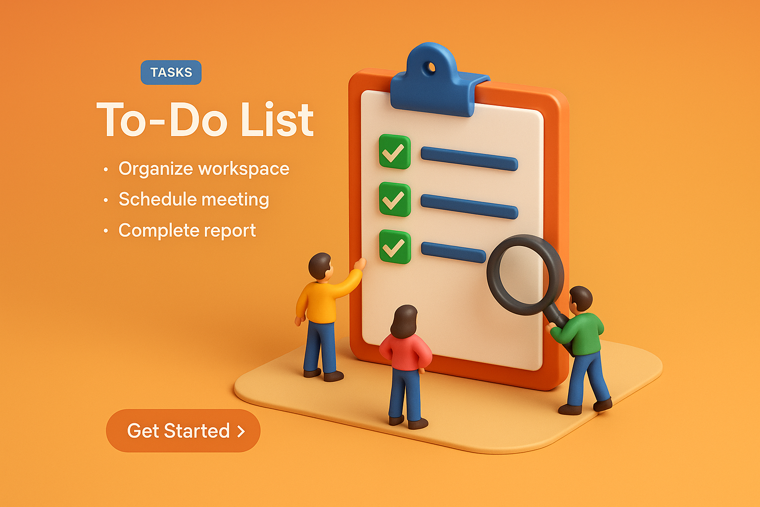 A vibrant 3D scene depicting small characters interacting with a to-do list clipboard. The background features a smooth gradient, creating a warm and inviting atmosphere.