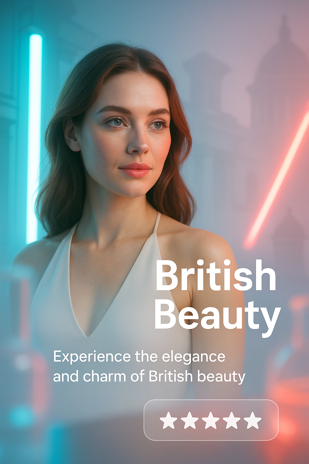 /Collection: /by davooda/Type: PNG/Stylish portrait photo showcasing a model with a focus on British beauty, featuring modern lighting effects and a soft color palette, ideal for beauty or fashion marketing.
