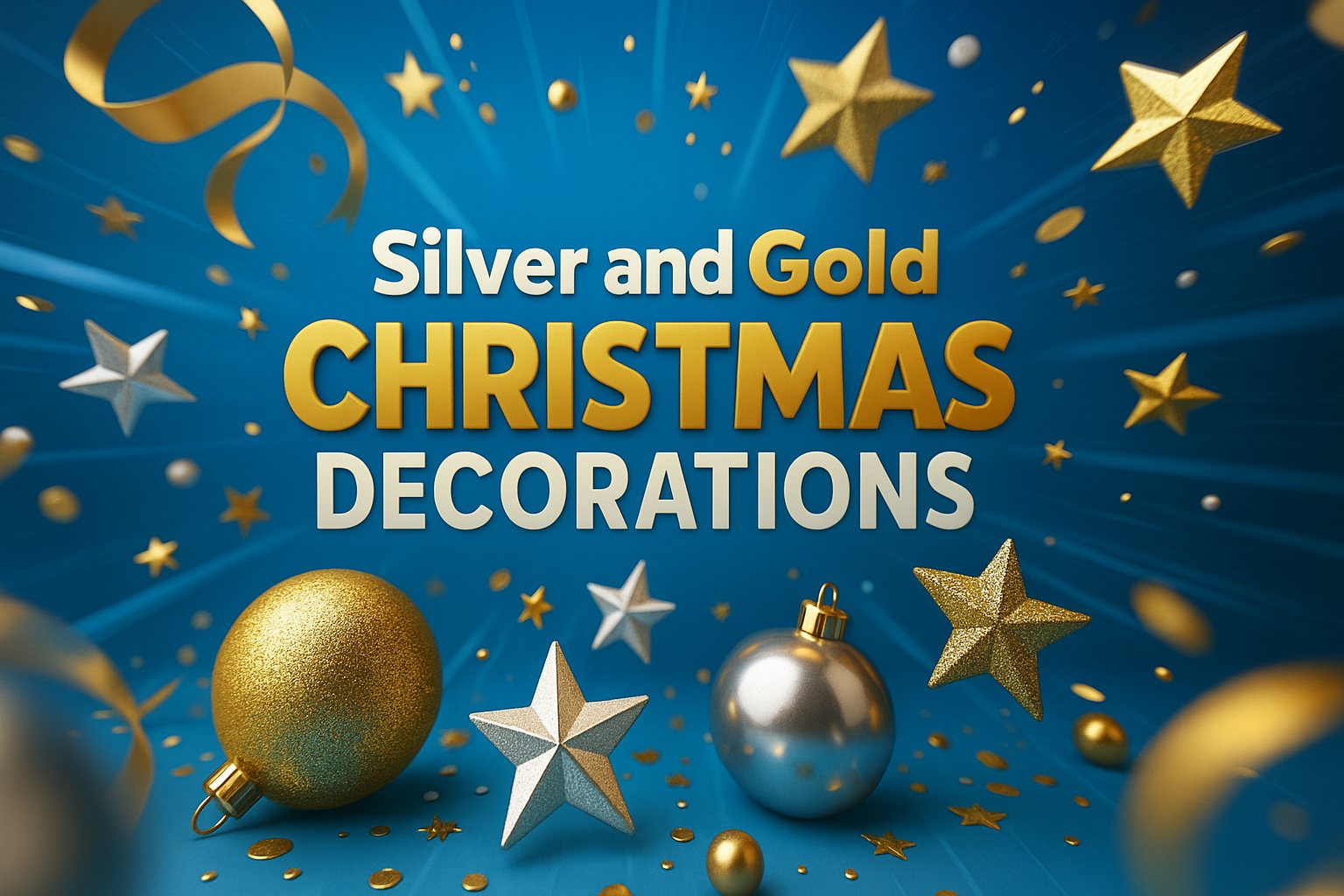 Dynamic Silver and Gold Christmas Decorations on Blue Background