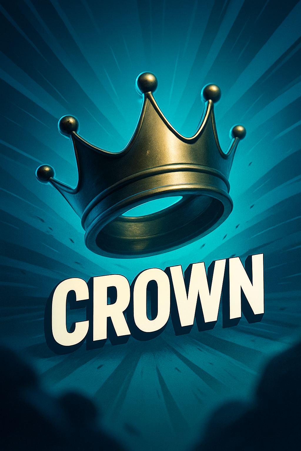 A striking 3D illustration of a crown, prominently displayed with dynamic rays emanating from the center. The bold typography of 'CROWN' enhances the visual appeal.