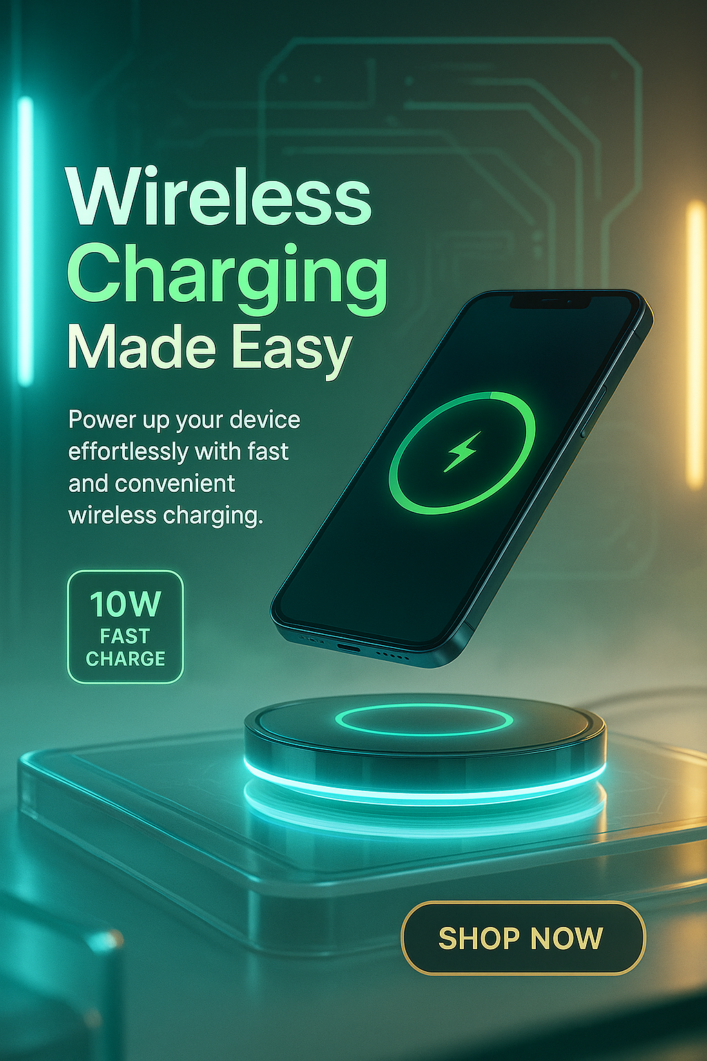 Promotional image showcasing a sleek smartphone and wireless charging pad with a modern and futuristic aesthetic, ideal for e-commerce and tech marketing.