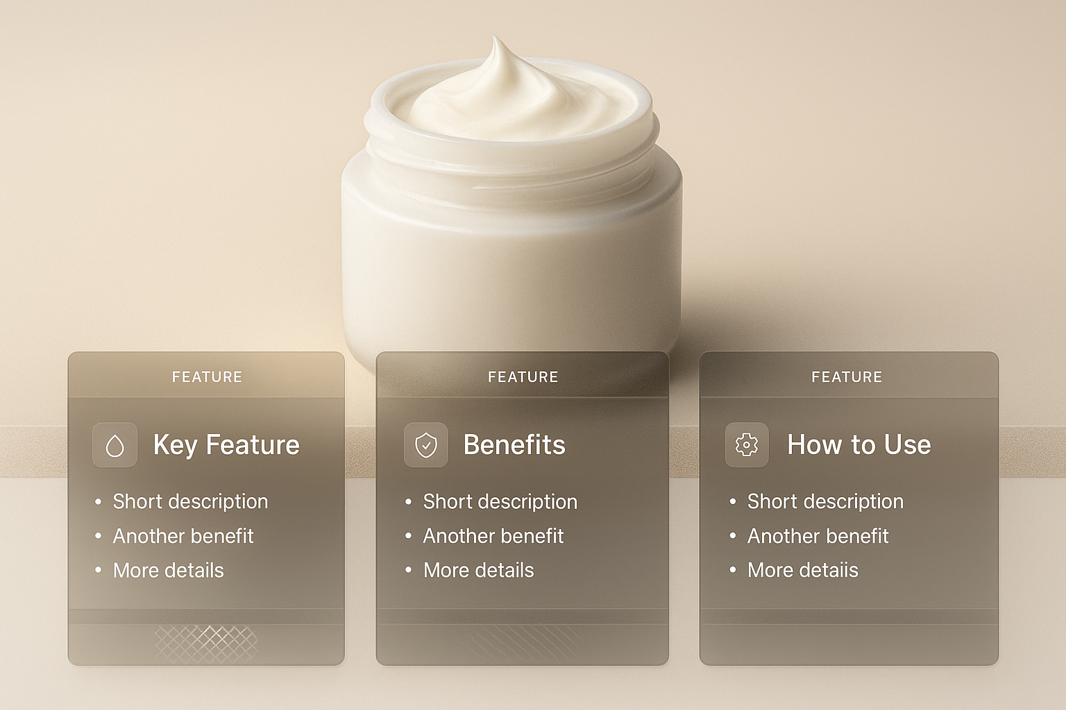 This image showcases a stylish cream jar on a soft gradient background, complemented by three informative blocks detailing features, benefits, and usage instructions.