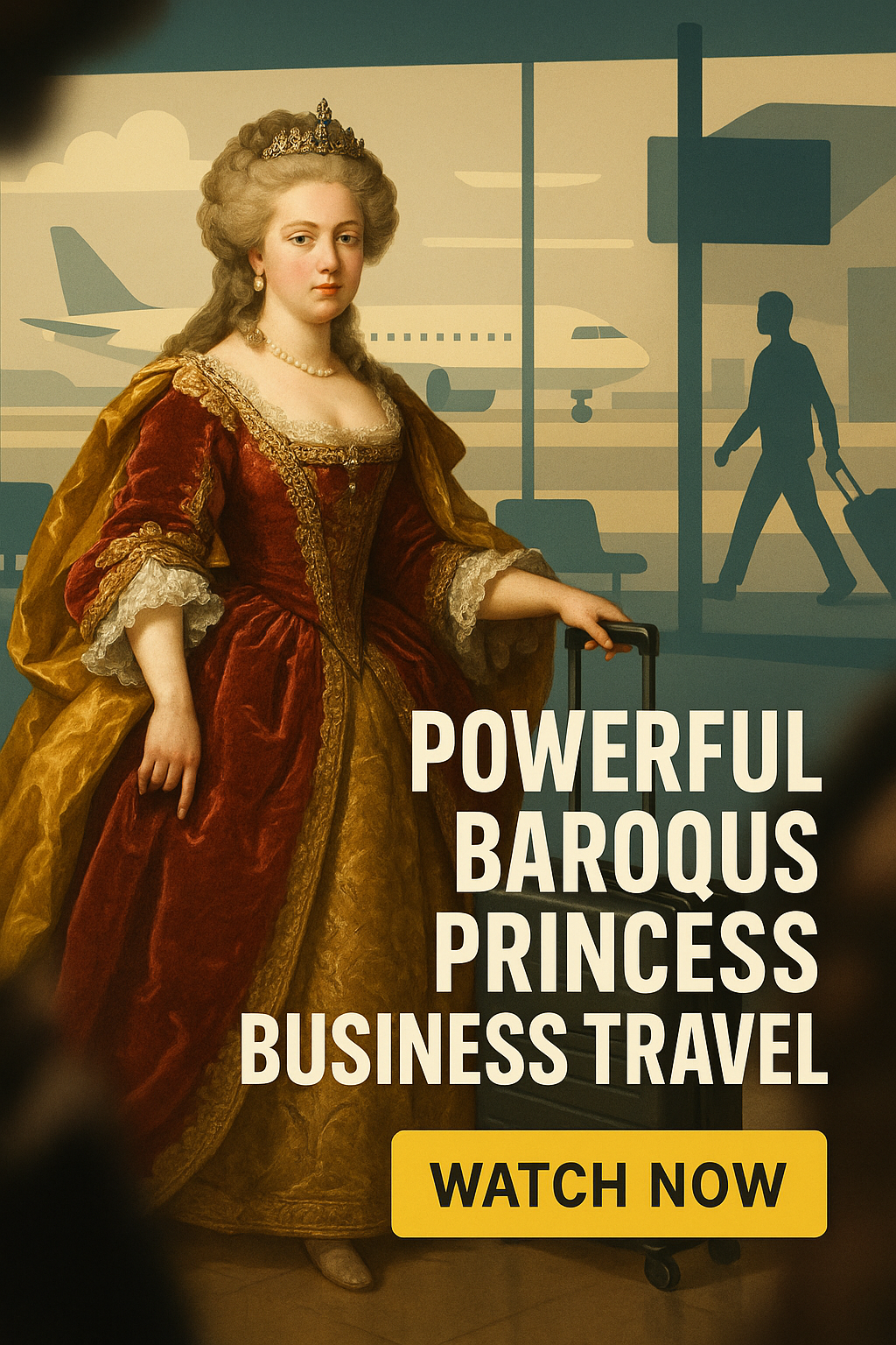 /Collection: /by davooda/Type: PNG/A visually striking promotional graphic that blends historical imagery with modern themes, showcasing a Baroque princess in a business travel context. Ideal for travel-related campaigns.