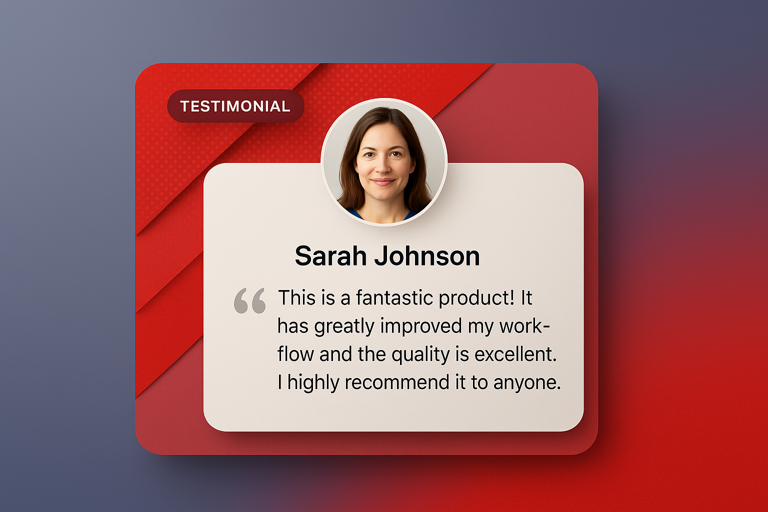 A visually appealing testimonial block featuring a circular photo of Sarah Johnson, with a red geometric background and a quote emphasizing the product's quality.