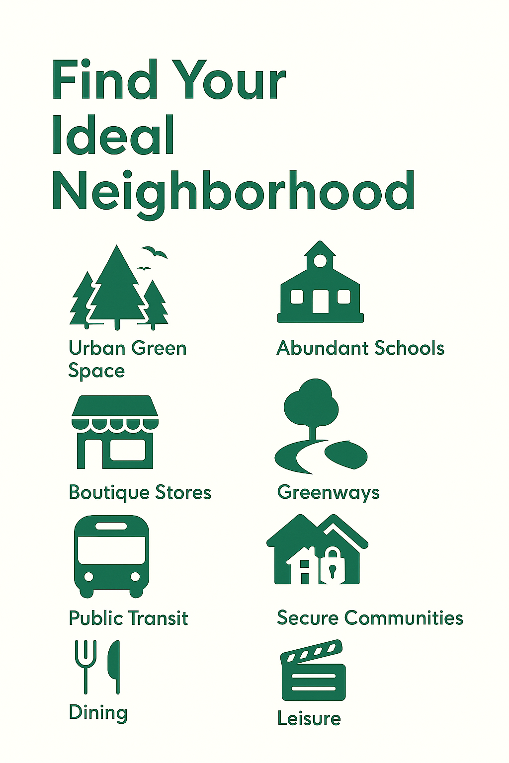 /Collection: /by davooda/Type: PNG/A visually appealing infographic showcasing key amenities and features of ideal neighborhoods, designed for potential homebuyers or residents looking for community highlights.