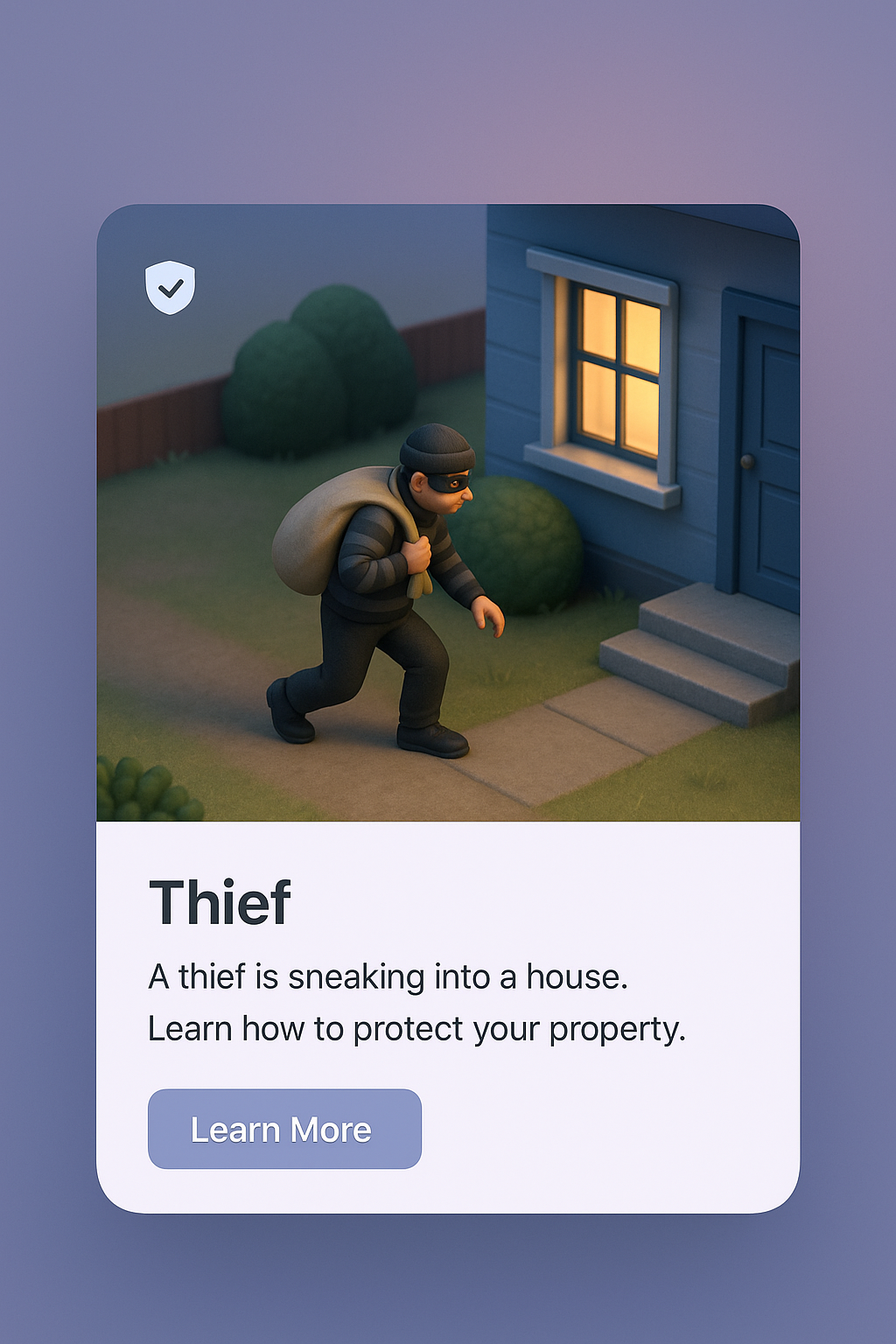 A realistic 3D illustration depicting a thief sneaking towards a house at night. The scene captures the tension and environment with soft gradients and minimal details.
