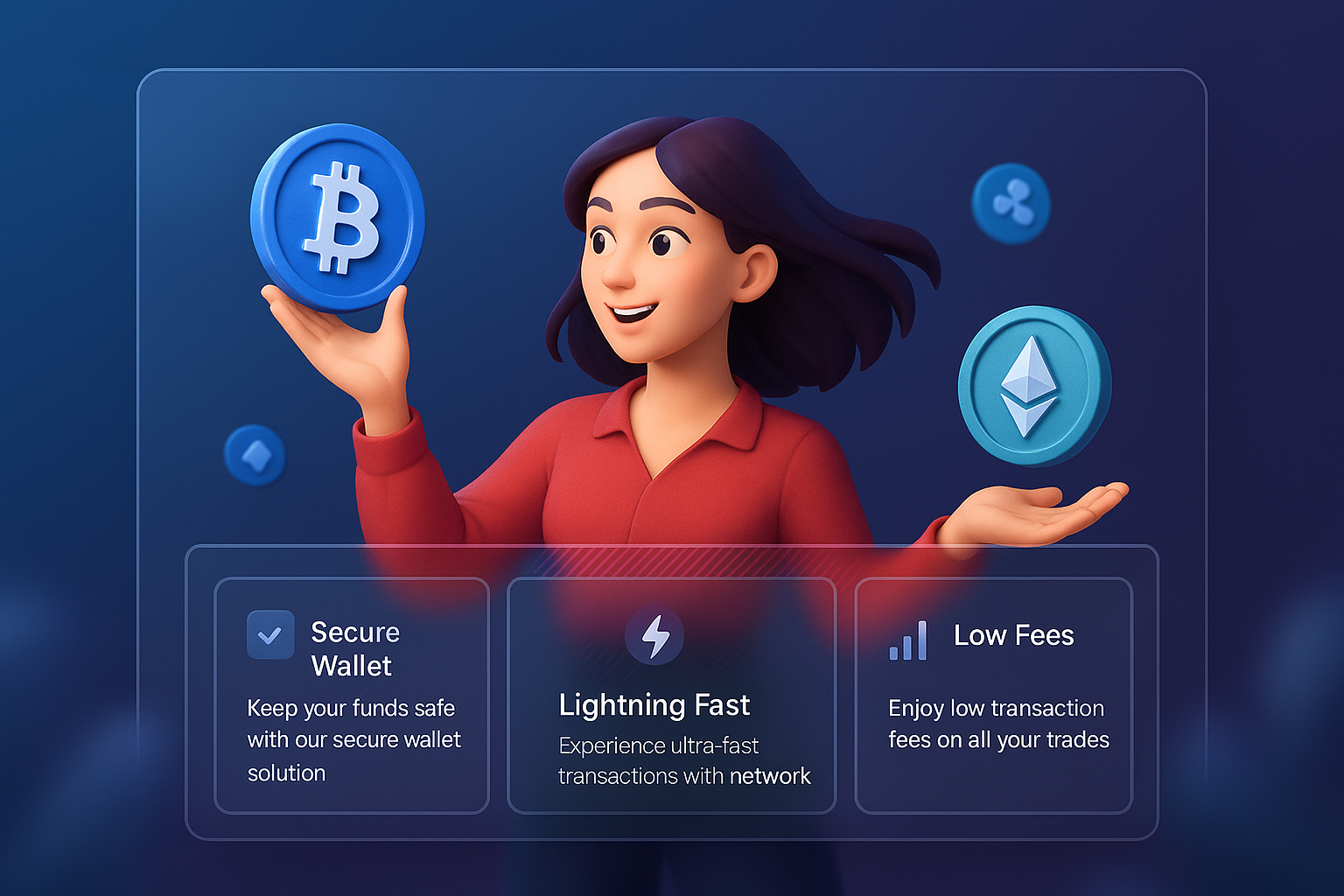 /Collection: /by davooda/Type: PNG/A vibrant 3D illustration of a woman holding cryptocurrency coins, with a background featuring a smooth gradient. The design includes informative blocks highlighting wallet security, transaction speed, and low fees.