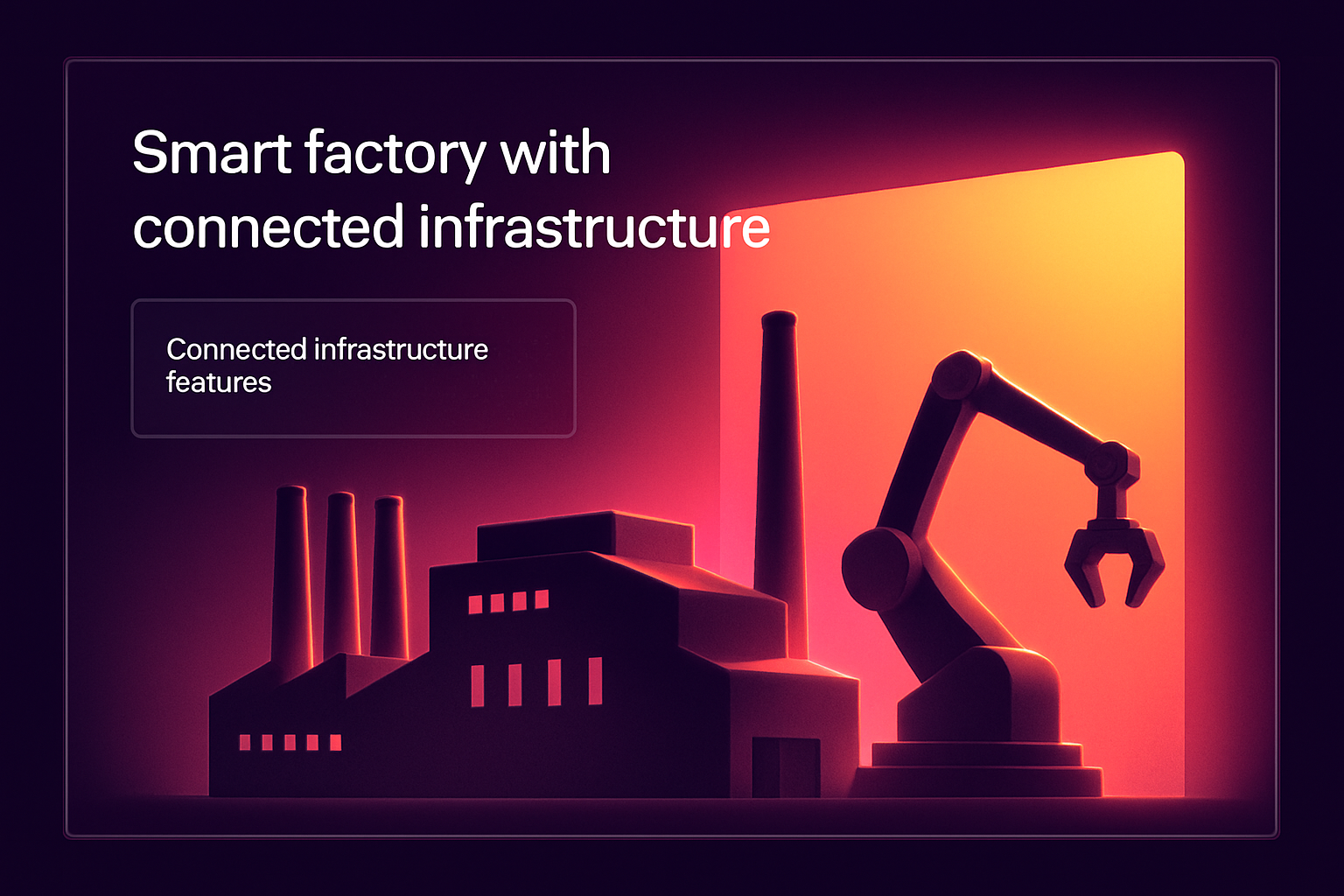/Collection: /by davooda/Type: PNG/This image illustrates a smart factory with a connected infrastructure, highlighted by backlighting. A modern robotic arm is featured against a gradient backdrop of vibrant colors, showcasing a blend of industrial elements.