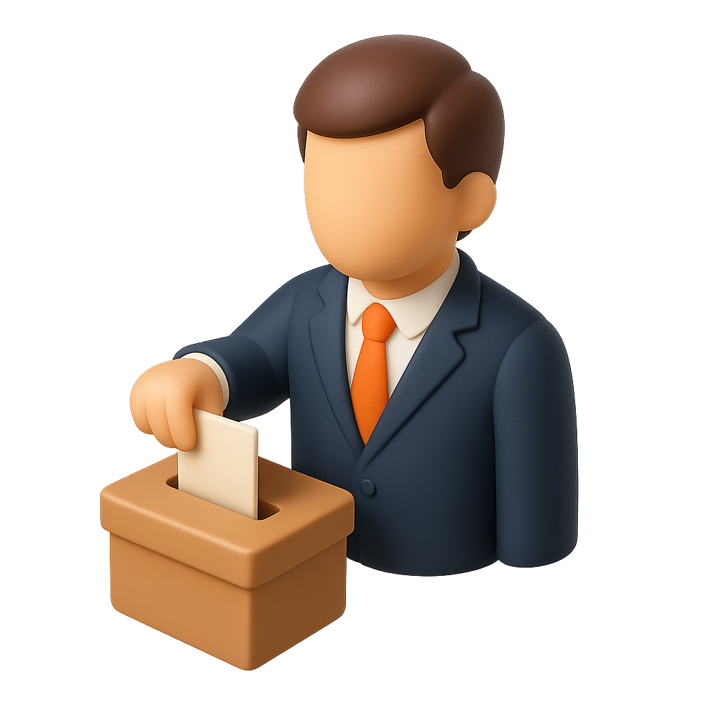 A 3D icon depicting a person in a suit casting a vote into a ballot box. The design features a transparent background, a three-quarter perspective, and a volumetric feel.