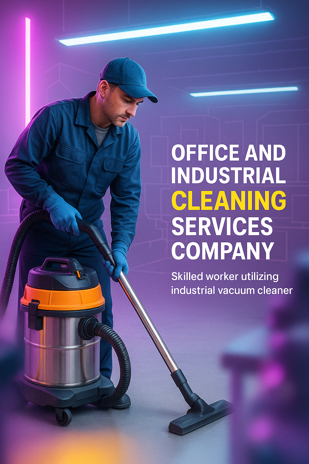 /Collection: /by davooda/Type: PNG/Promotional image showcasing a skilled worker using an industrial vacuum cleaner, designed for a cleaning services company. The modern, vibrant aesthetic appeals to businesses seeking professional cleaning solutions.