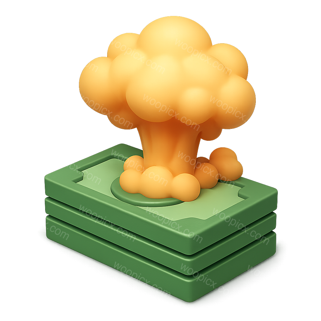 A visually striking 3D icon featuring a stack of money with an explosion effect, emitting orange smoke. The design is isometric and volumetric, set against a gradient background.