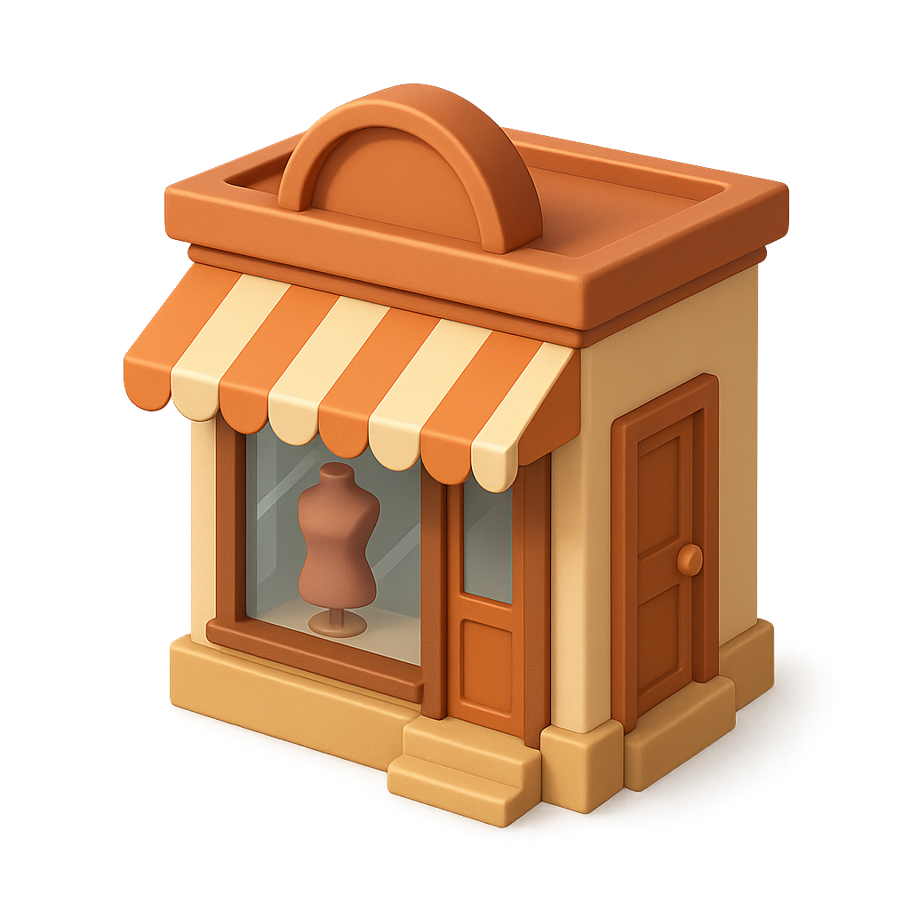 A charming 3D boutique icon featuring a shop with a striped awning, a display window showcasing a mannequin, and a door. The design is presented in an isometric view on a transparent background.