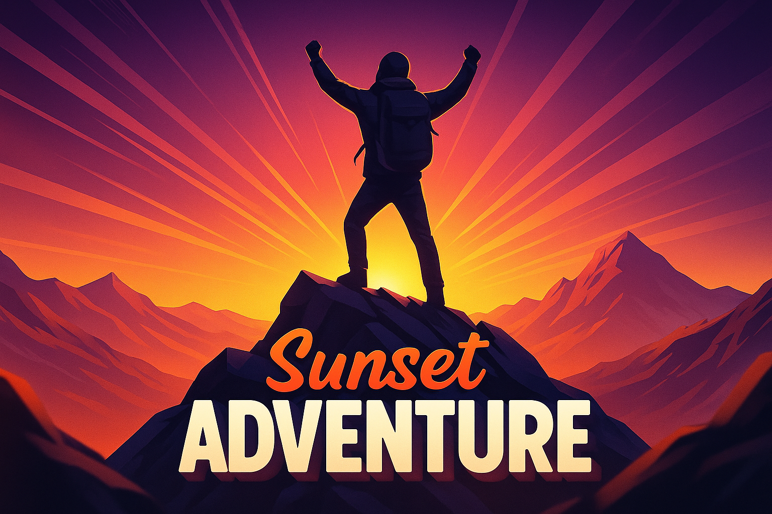 A silhouetted figure stands triumphantly atop a mountain during a vibrant sunset, surrounded by dynamic rays and layered colors in a stunning gradient.