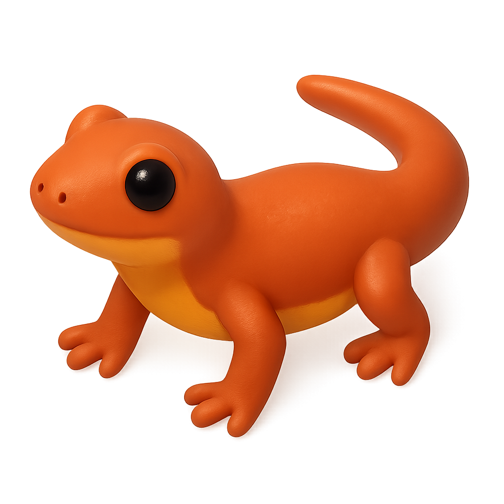 This image features a stylized 3D icon of an orange-bellied newt. The character is depicted in a three-quarter view with a smooth, volumetric appearance against a soft gradient background.
