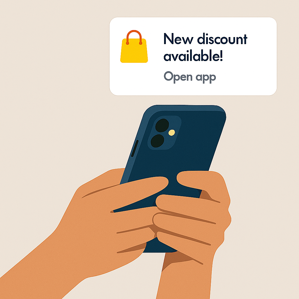 Illustrative graphic depicting a mobile phone notification about a new discount, featuring a clean and modern design. Ideal for marketing and promotional content.
