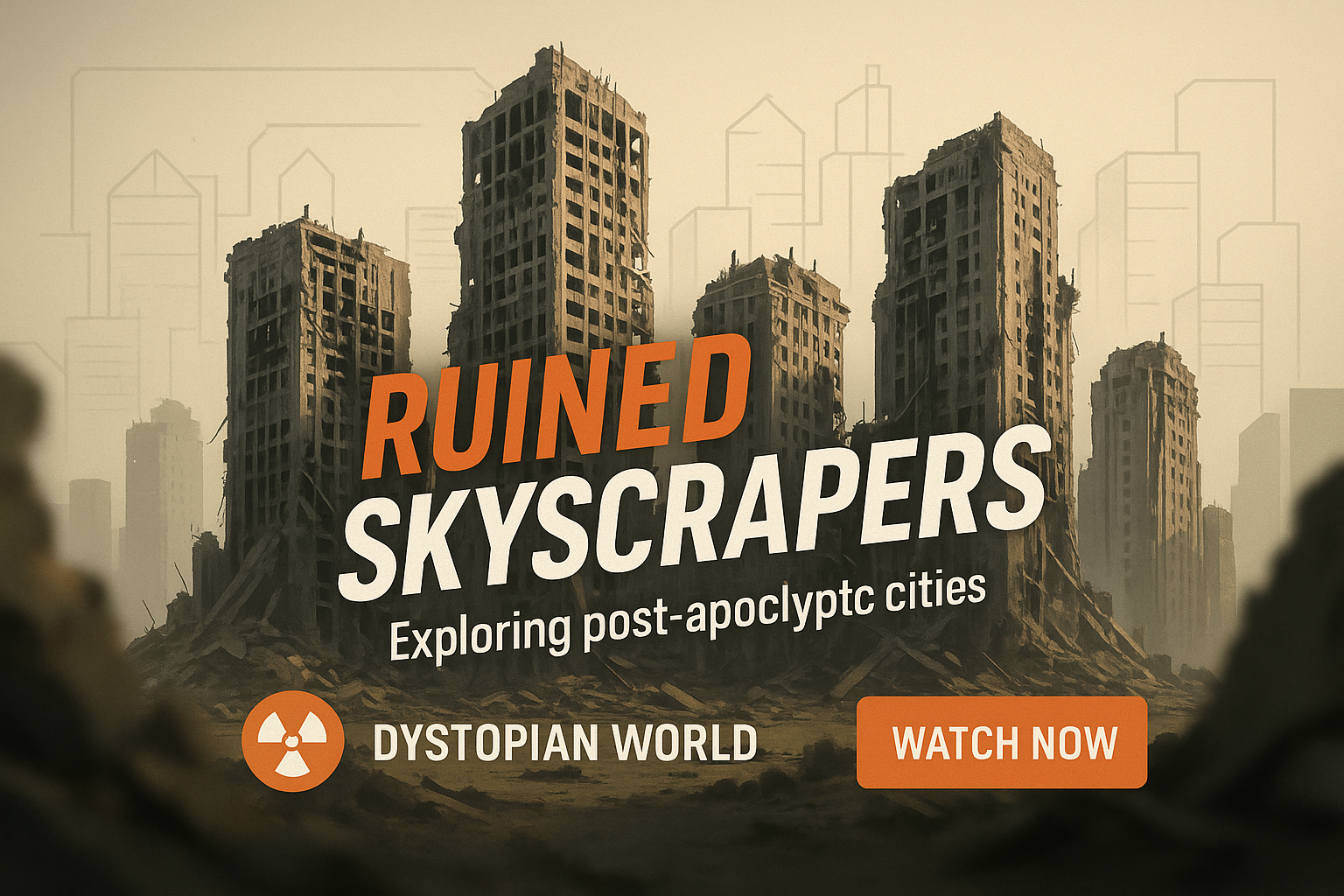 Visually striking promotional image featuring ruined skyscrapers in a post-apocalyptic setting, designed for a video series about exploring dystopian worlds.