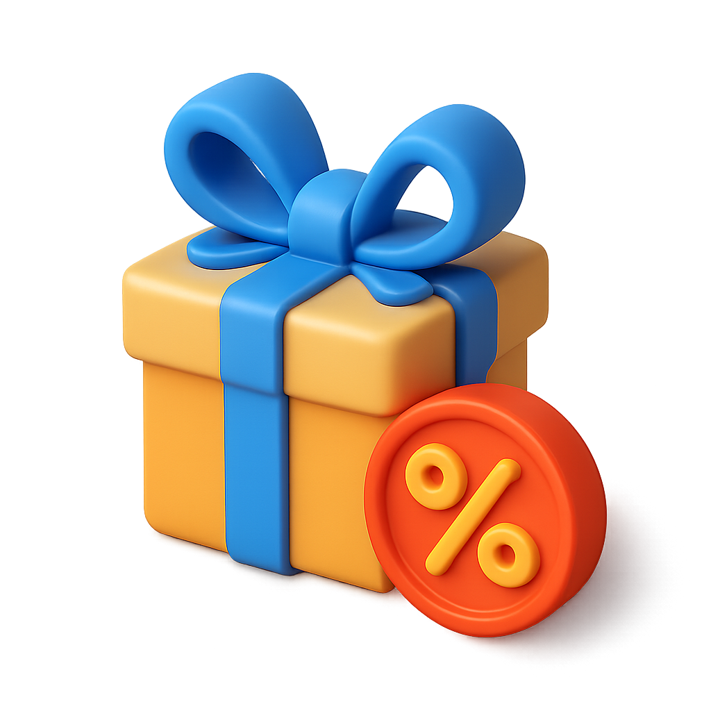 A colorful 3D gift box adorned with a blue ribbon, accompanied by a bright orange percentage icon. The design features a transparent background and is presented in a three-quarter isometric view.