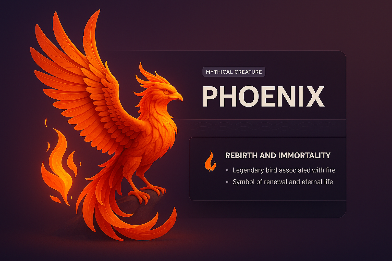 /Collection: /by davooda/Type: PNG/A vibrant 3D illustration of a phoenix with fiery wings, against a smooth gradient background. The image features an informational block with a title and description.