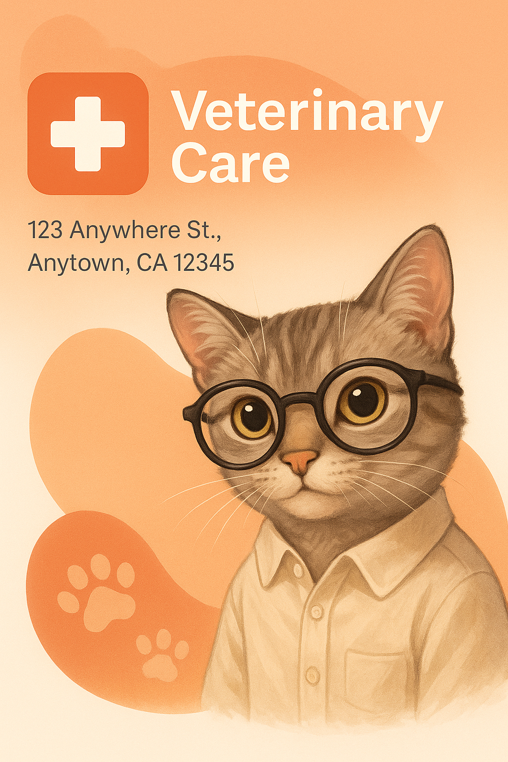 /Collection: /by davooda/Type: PNG/Charming veterinary care poster featuring a cute cat wearing glasses. The warm color palette and playful design are perfect for attracting pet owners and creating a friendly atmosphere.