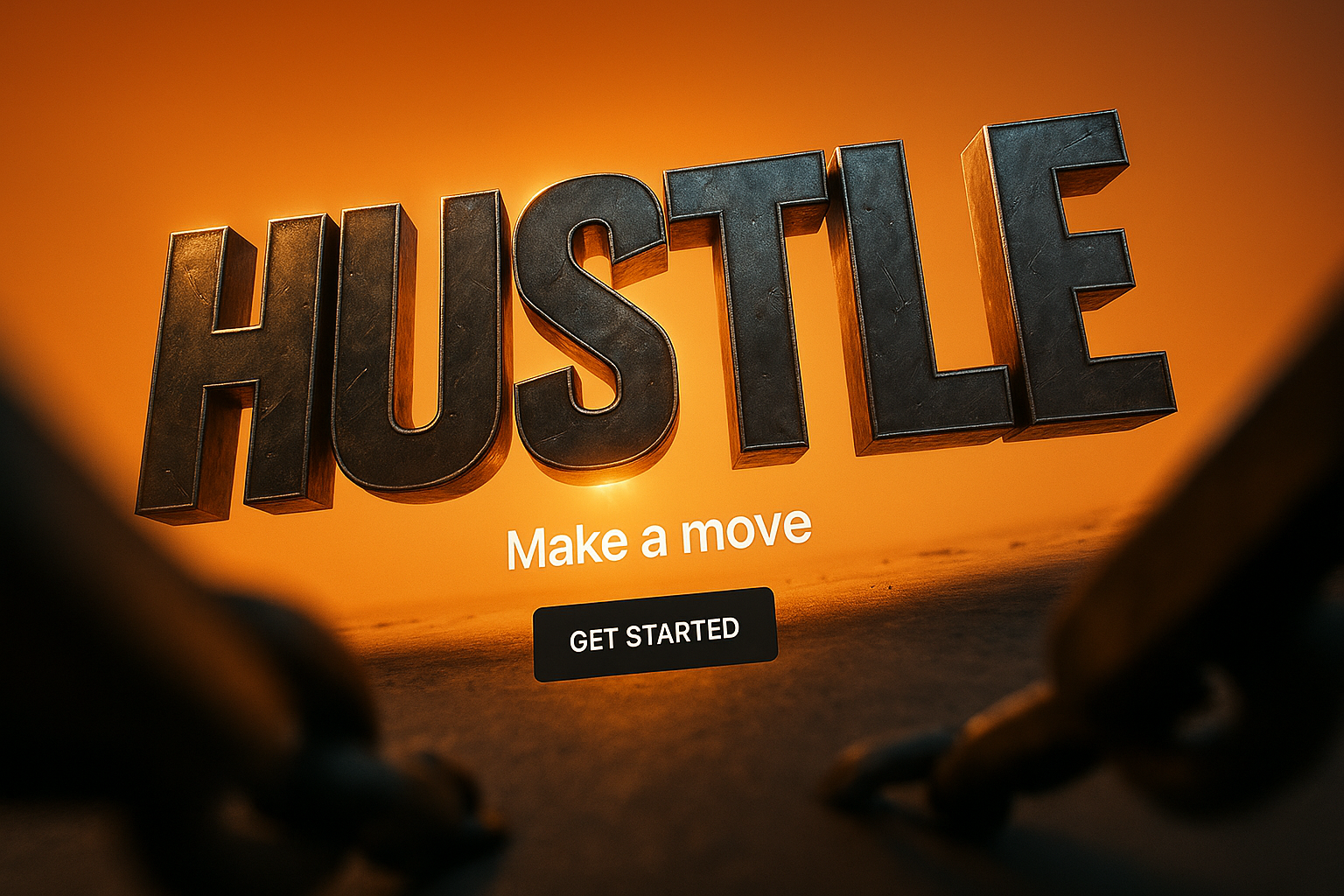 /Collection: /by davooda/Type: PNG/A vibrant 3D graphic featuring the word 'HUSTLE' against an orange backdrop. Ideal for motivational content or business campaigns aimed at encouraging action and productivity.
