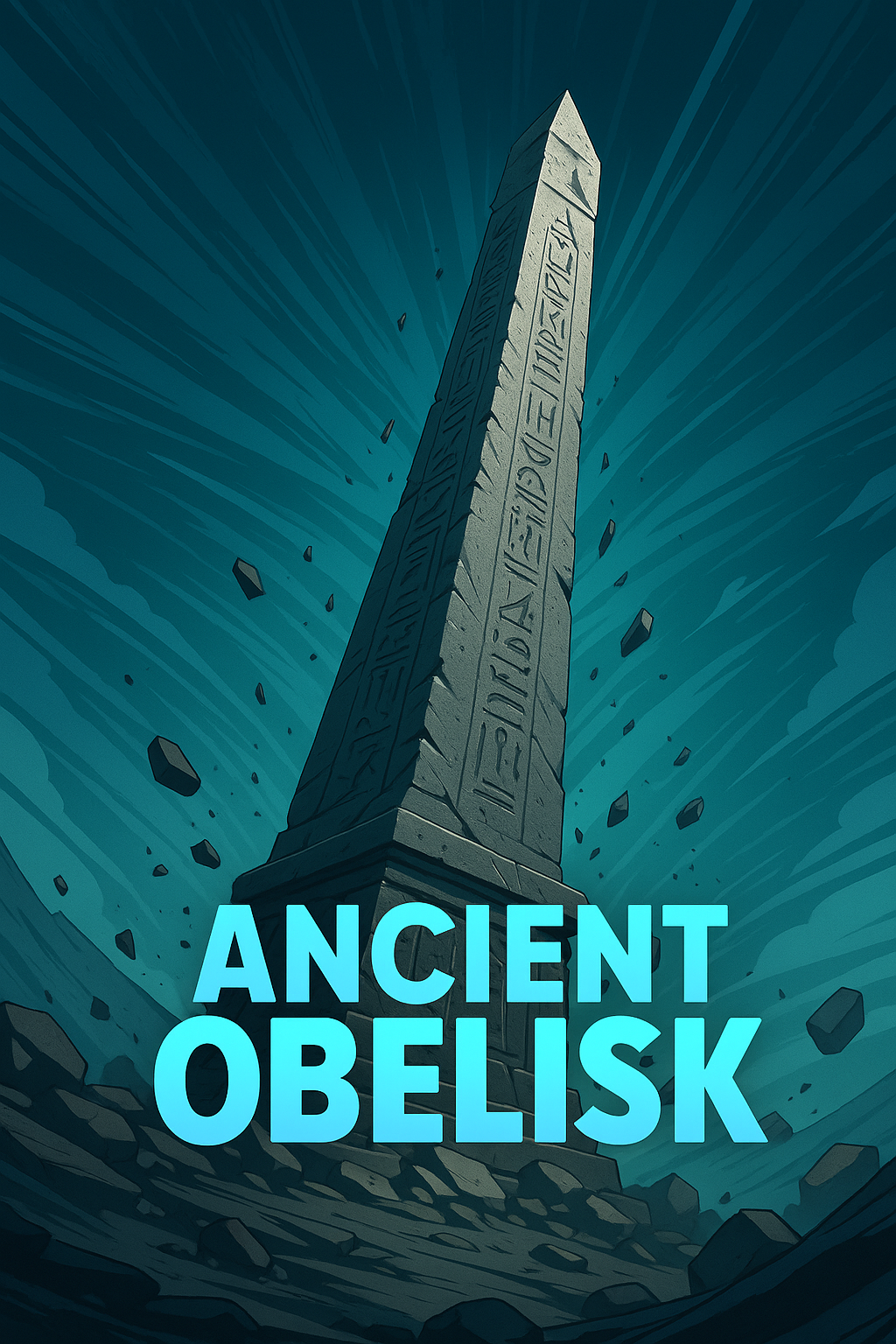 /Collection: /by davooda/Type: PNG/A visually dynamic representation of an ancient obelisk, towering amidst a dramatic background of lines radiating outwards. The scene features bold text and layered composition for depth.