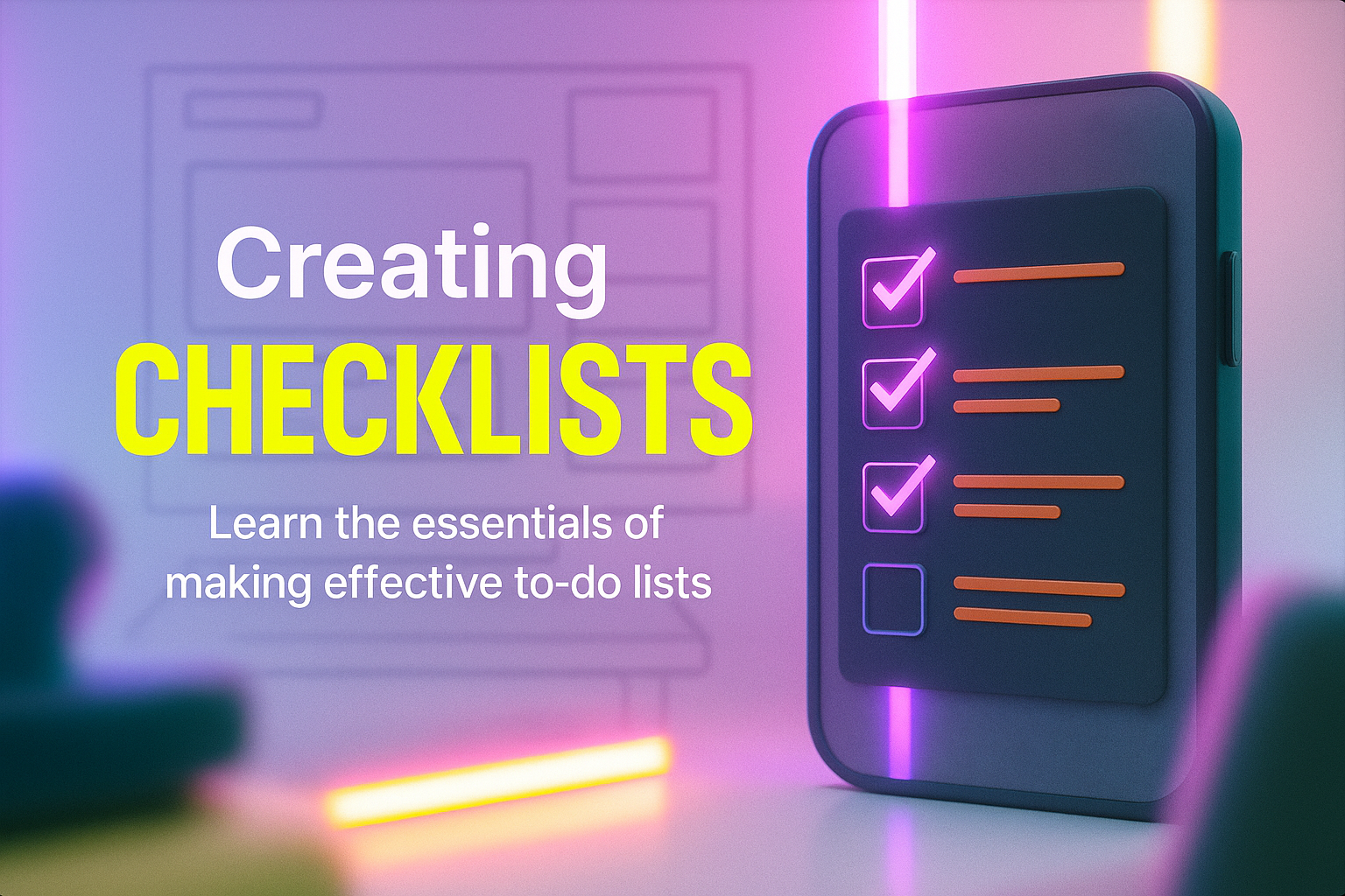 Neon-Themed 3D Scene with Task List and Mug