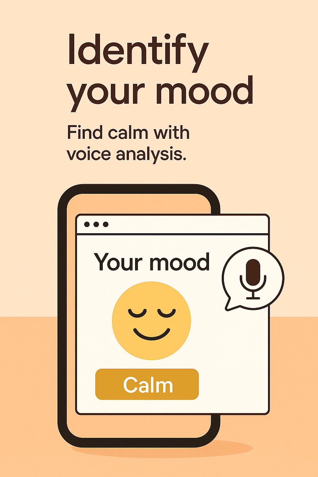 /Collection: /by davooda/Type: PNG/A modern graphic representing a mobile app interface for mood identification through voice analysis. Features a cheerful emoji and soothing design elements, ideal for mental wellness applications.