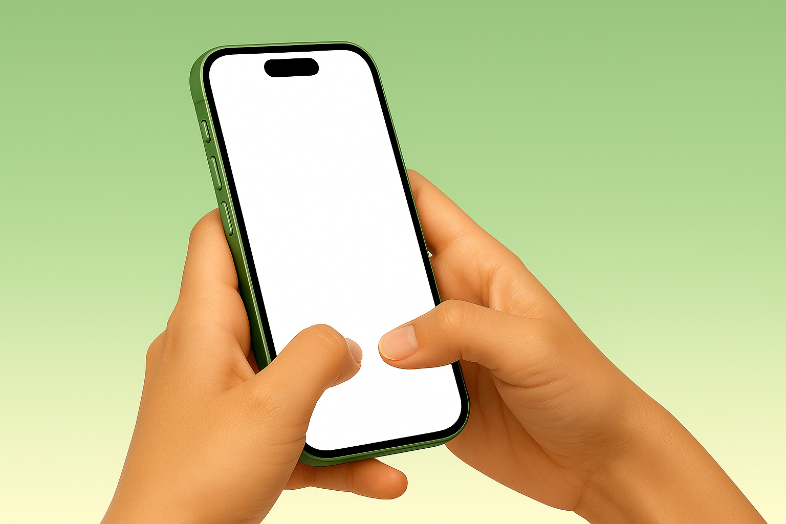A pair of hands holding a green smartphone with a blank white screen. The phone has rounded edges and is slightly slimmer, set against a soft gradient background.