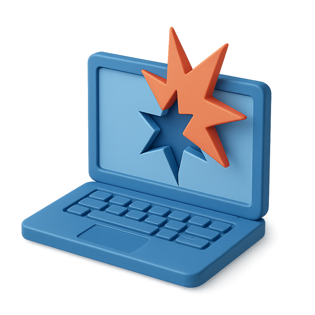 /Collection: /by davooda/Type: PNG/A 3D representation of a computer with a breach effect, featuring a star-shaped explosion. The design is isometric, showcasing a vibrant blue laptop with a striking orange star.