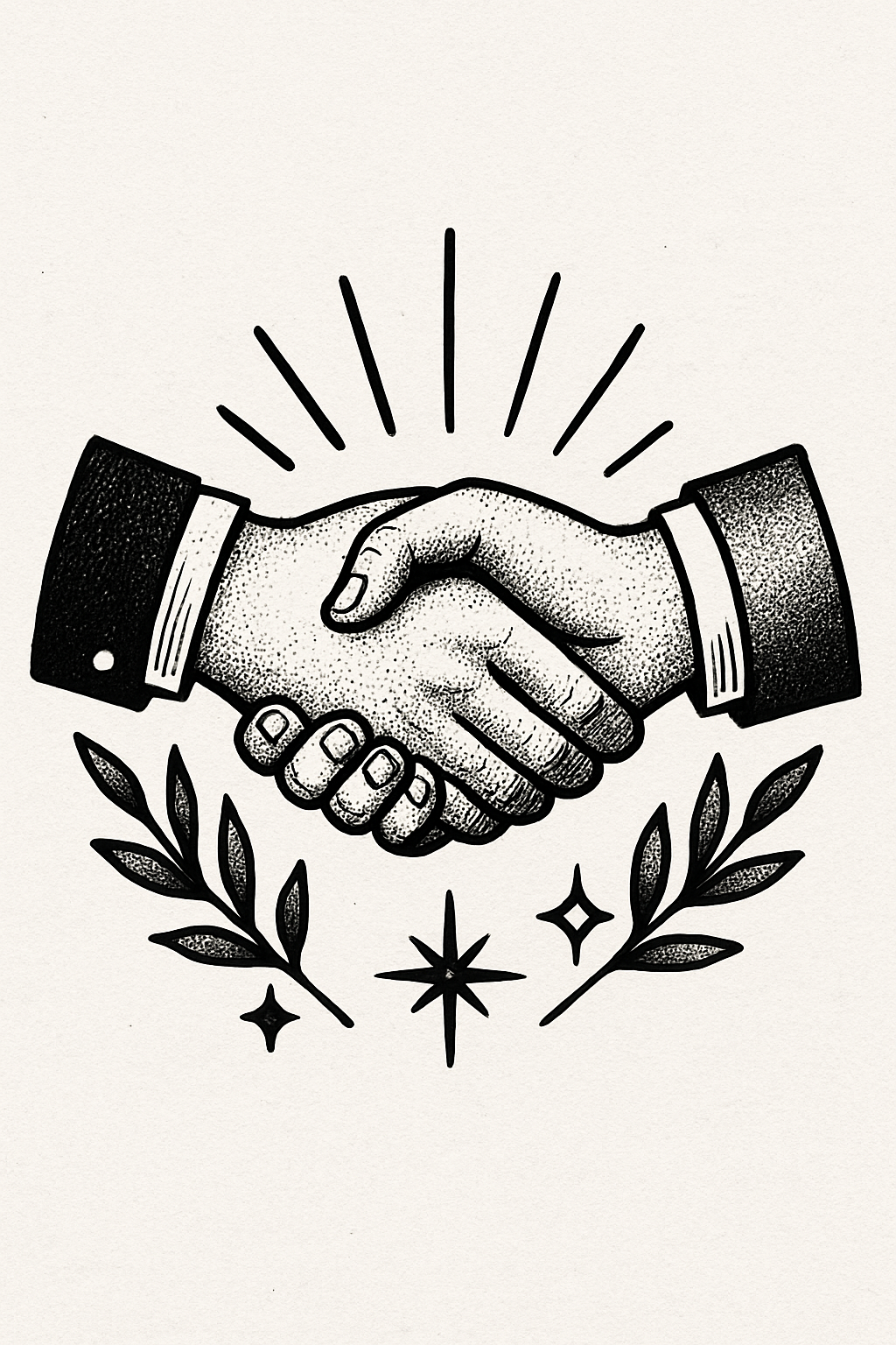 /Collection: /by davooda/Type: PNG/This image features a vintage-style illustration of a handshake, surrounded by decorative elements like rays and foliage. It is ideal for branding or partnership themes.