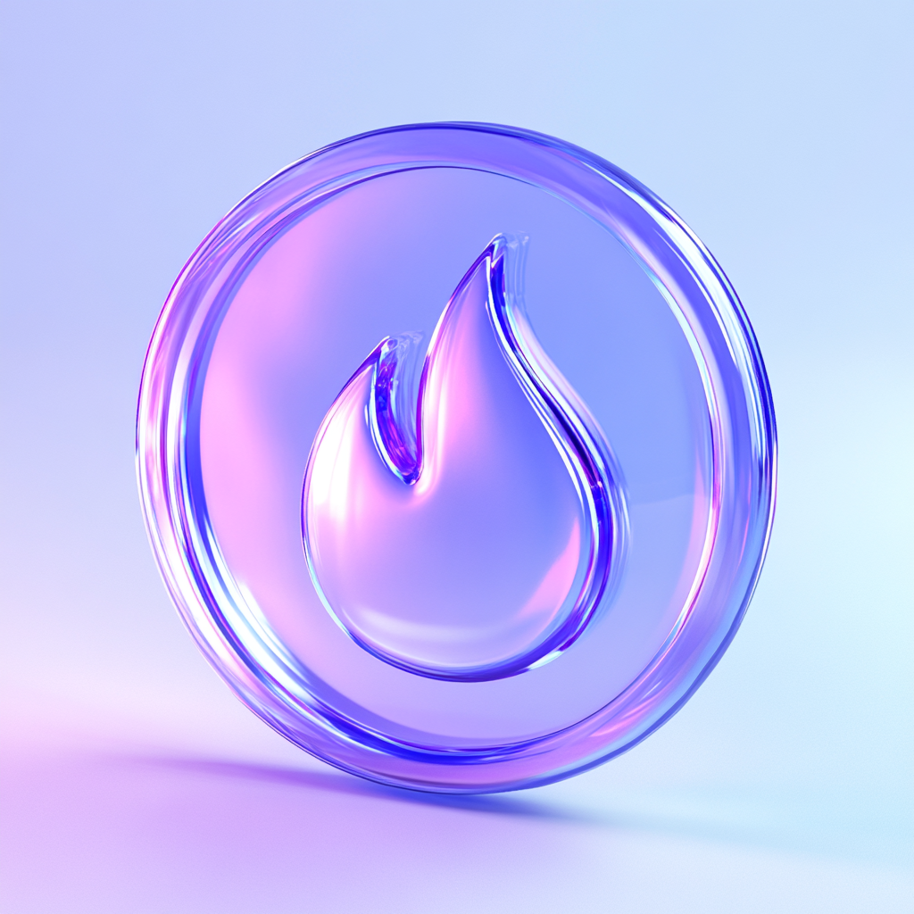 A modern glass-like icon featuring a flame design, rendered with gradient colors. Ideal for digital branding, app icons, or as a decorative graphic element.