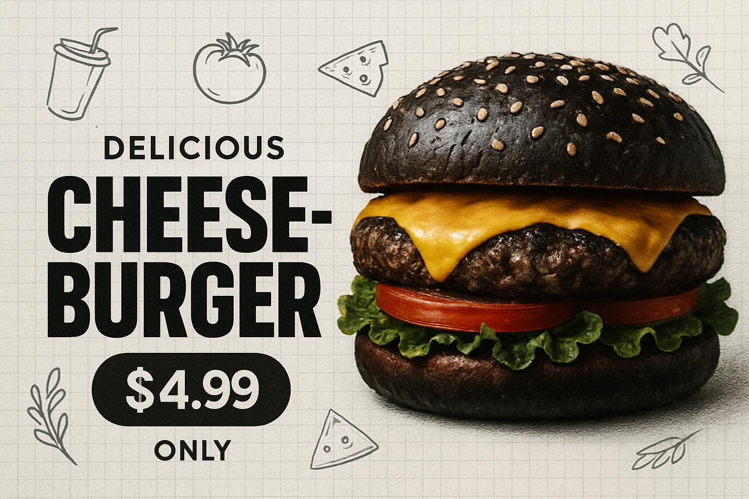 /Collection: /by davooda/Type: PNG/A striking advertisement layout featuring a realistic cheese burger on grid paper texture. Bold typography highlights the product name and price, complemented by simple contour drawings.