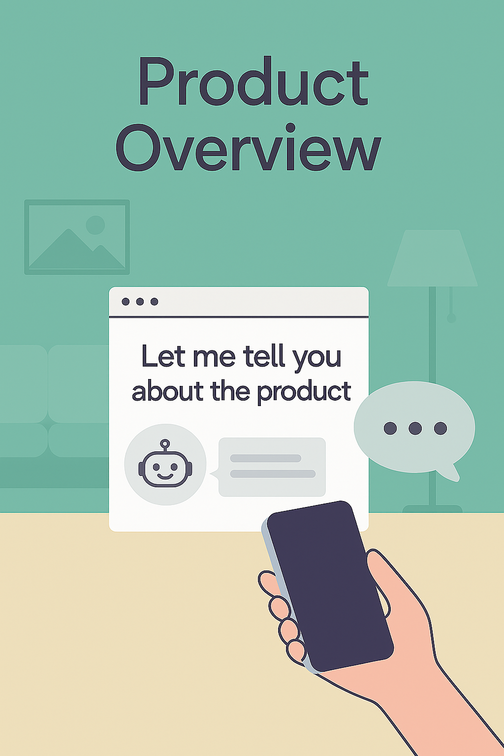 Illustrative graphic showcasing a product overview concept with a hand holding a smartphone, ideal for digital marketing or app promotion.