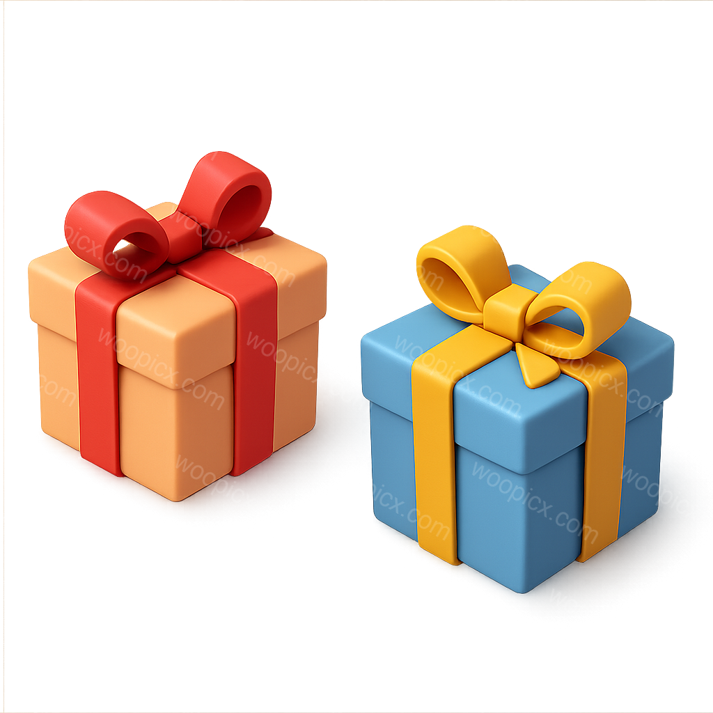 Two vibrant 3D gift boxes with bows, one in orange with a red ribbon and the other in blue with a yellow ribbon, presented in a three-quarter isometric view.