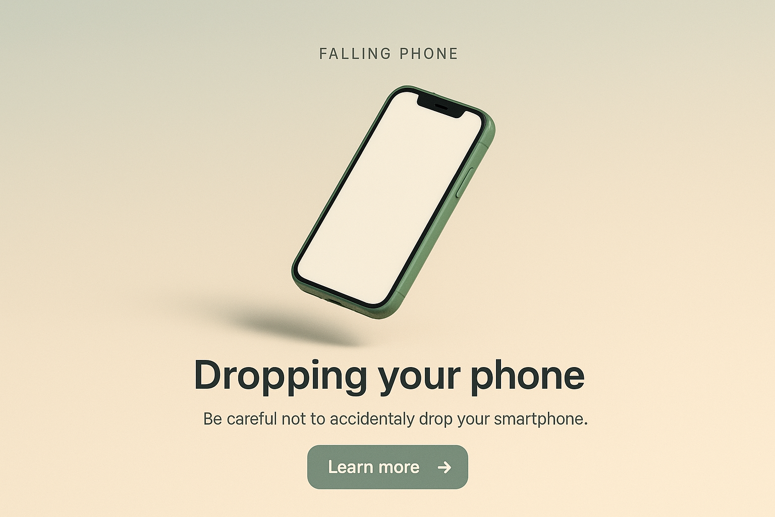 /Collection: /by davooda/Type: PNG/A 3D illustration of a green smartphone suspended in the air, displaying a white screen. Accompanied by a message about dropping phones and a 'Learn more' button, set against a smooth gradient background.
