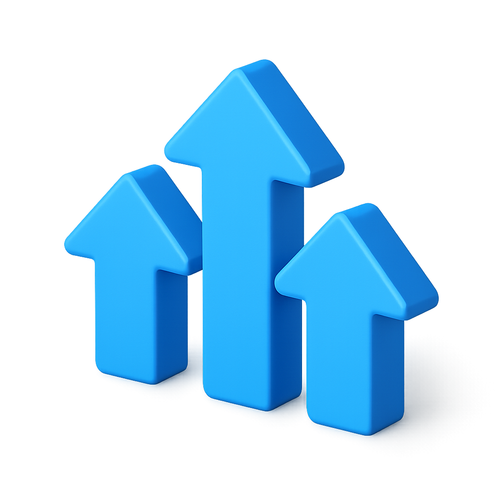 A visually striking 3D icon featuring three upward arrows in blue, presented in a three-quarter view with a glossy finish, set against a subtle gray background.