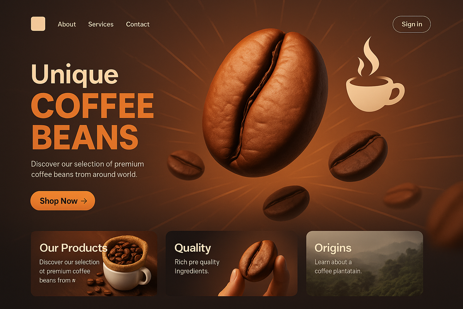 /Collection: /by davooda/Type: PNG/A visually engaging landing page design featuring dynamic coffee beans, a warm color palette, and a contemporary layout. Includes sections for products, quality, and origins.