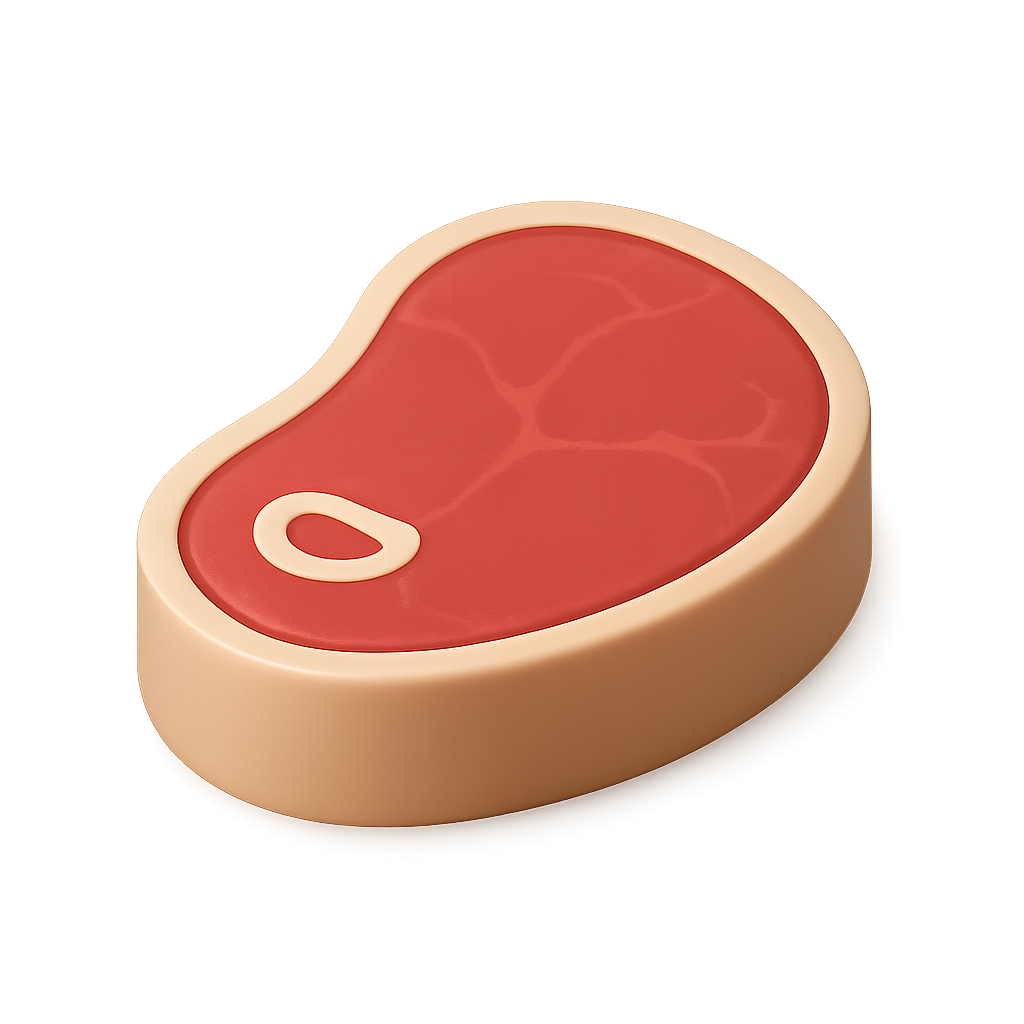This image features a stylized 3D beef steak icon rendered in a three-quarter view. The design showcases a smooth, volumetric shape with a soft color palette, set against a subtle gradient background.