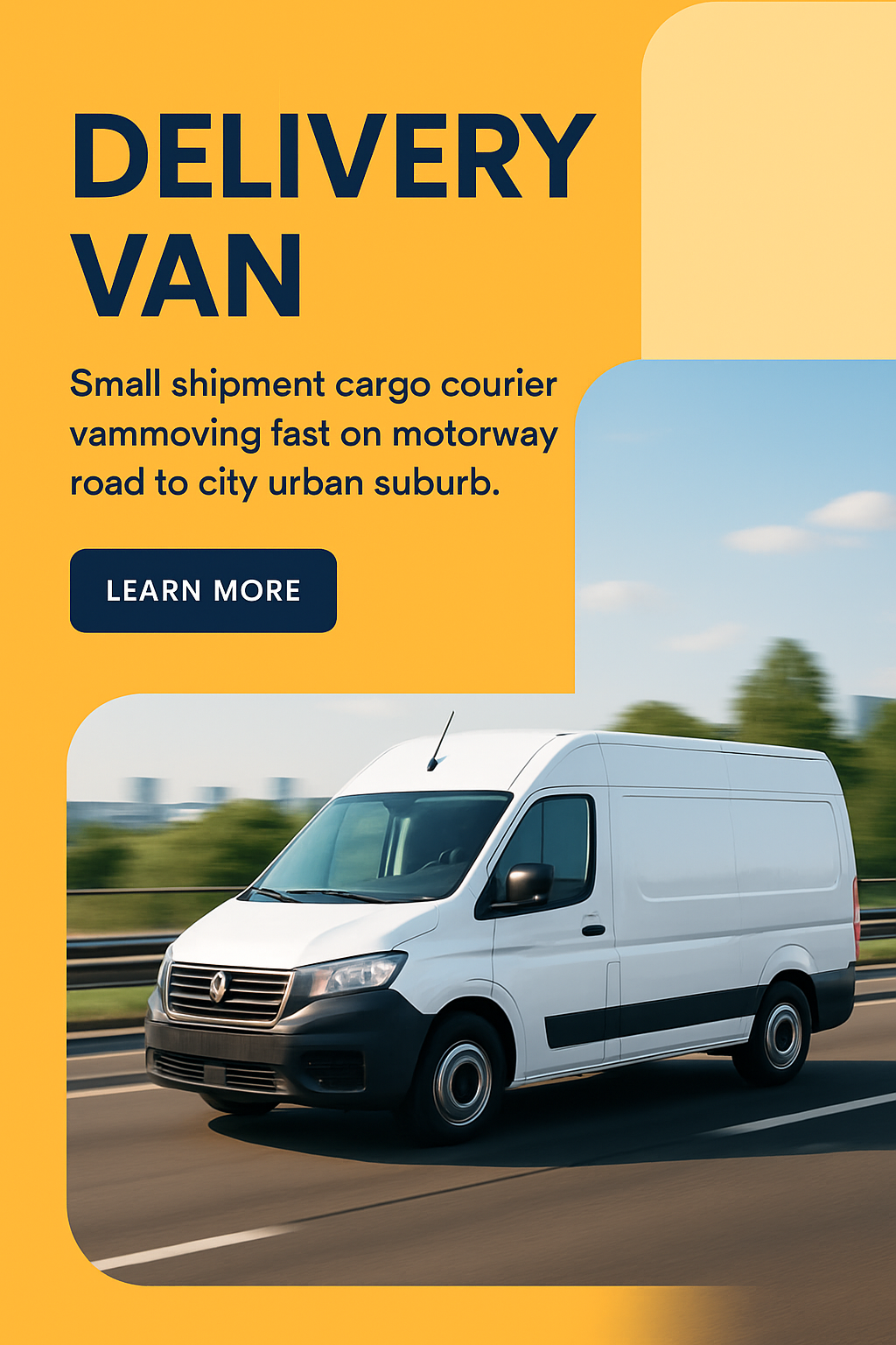 /Collection: /by davooda/Type: PNG/A sleek white courier van drives swiftly on a sunny motorway, symbolizing efficient logistics. The modern design features bold typography and a bright background, enhancing clarity.