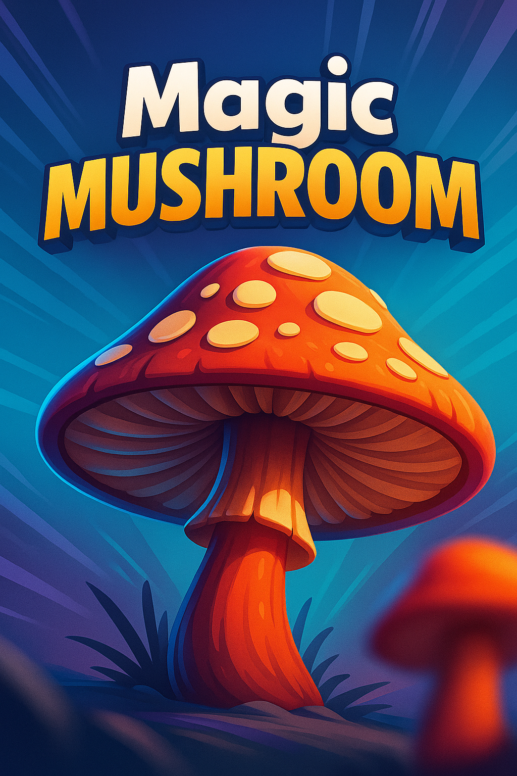 /Collection: /by davooda/Type: PNG/A vibrant 3D illustration of a magic mushroom, featuring dynamic rays emanating from its base. The background transitions smoothly, enhancing the mushroom's colorful details and bold title.