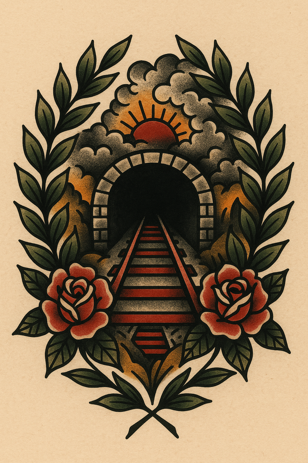 /Collection: /by davooda/Type: PNG/This image depicts a stylized tattoo design featuring a railway tunnel framed by roses and leaves. The warm color palette and bold outlines create a vintage aesthetic, appealing to tattoo enthusiasts.