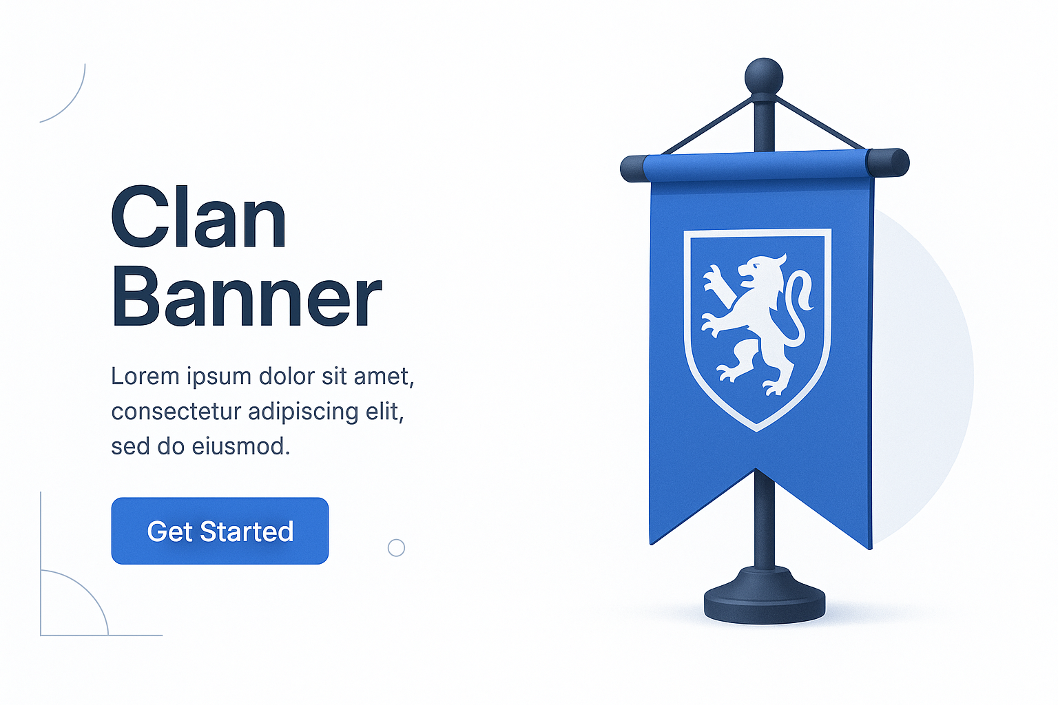 A clean, professional clan banner design featuring a stylized shield with a lion. The left side contains bold typography and a call-to-action button, creating a balanced layout.