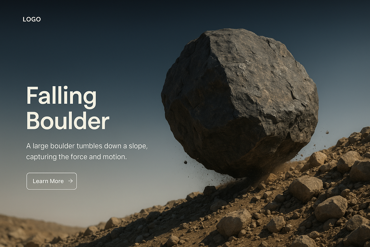 A striking image of a boulder tumbling down a slope, showcasing the energy and motion of nature. The scene is set against a gradient background, emphasizing realism.