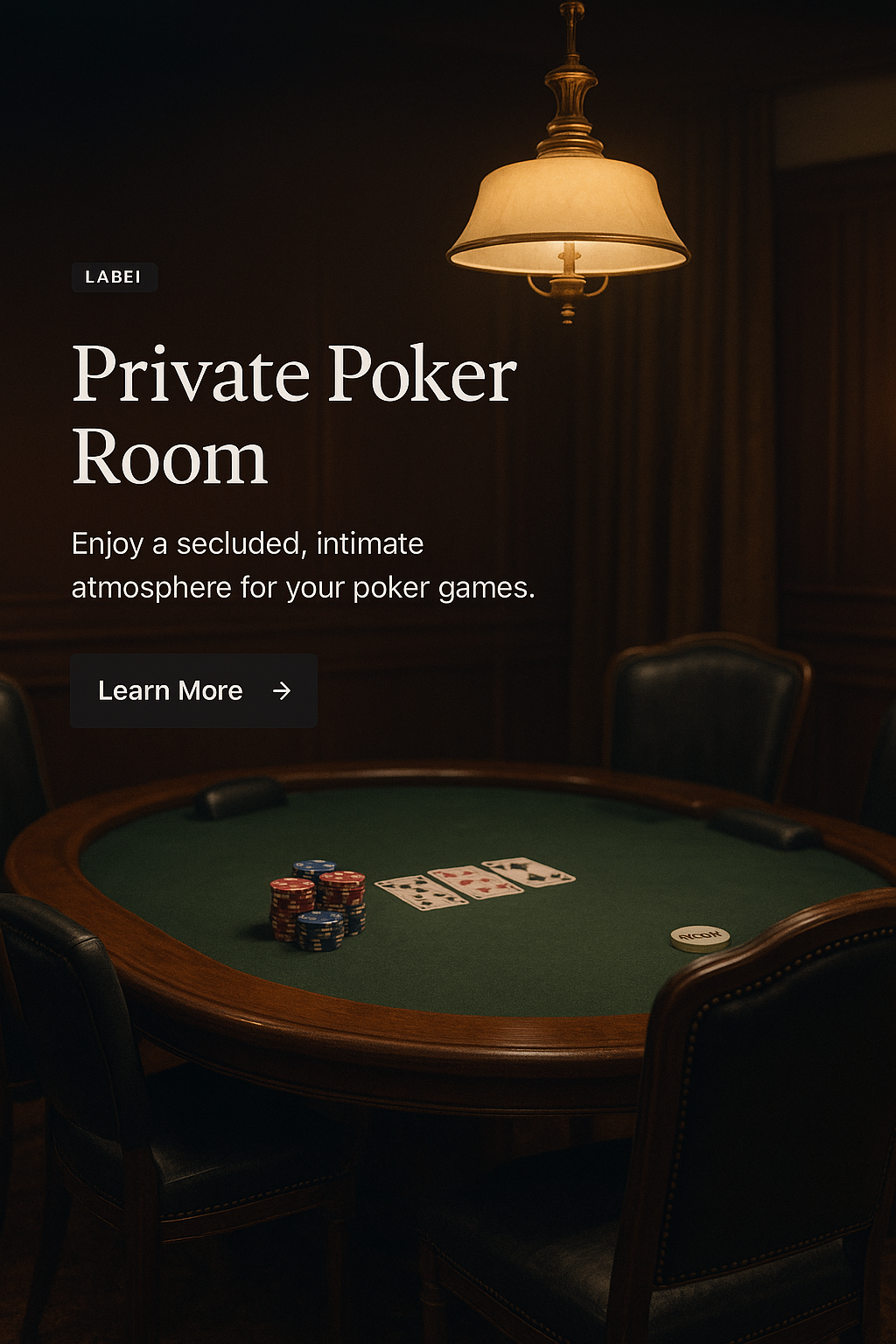 A well-designed private poker room featuring a dark ambiance, a green felt table, and stylish details. Perfect for an intimate gaming experience.