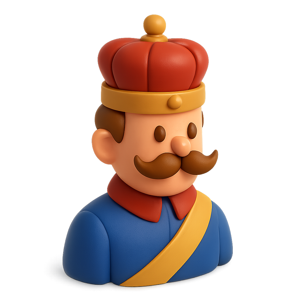A vibrant 3D icon of a duke character, showcasing a colorful crown and mustache. The design features a three-quarter view with a soft gradient background, emphasizing a volumetric and isometric style.
