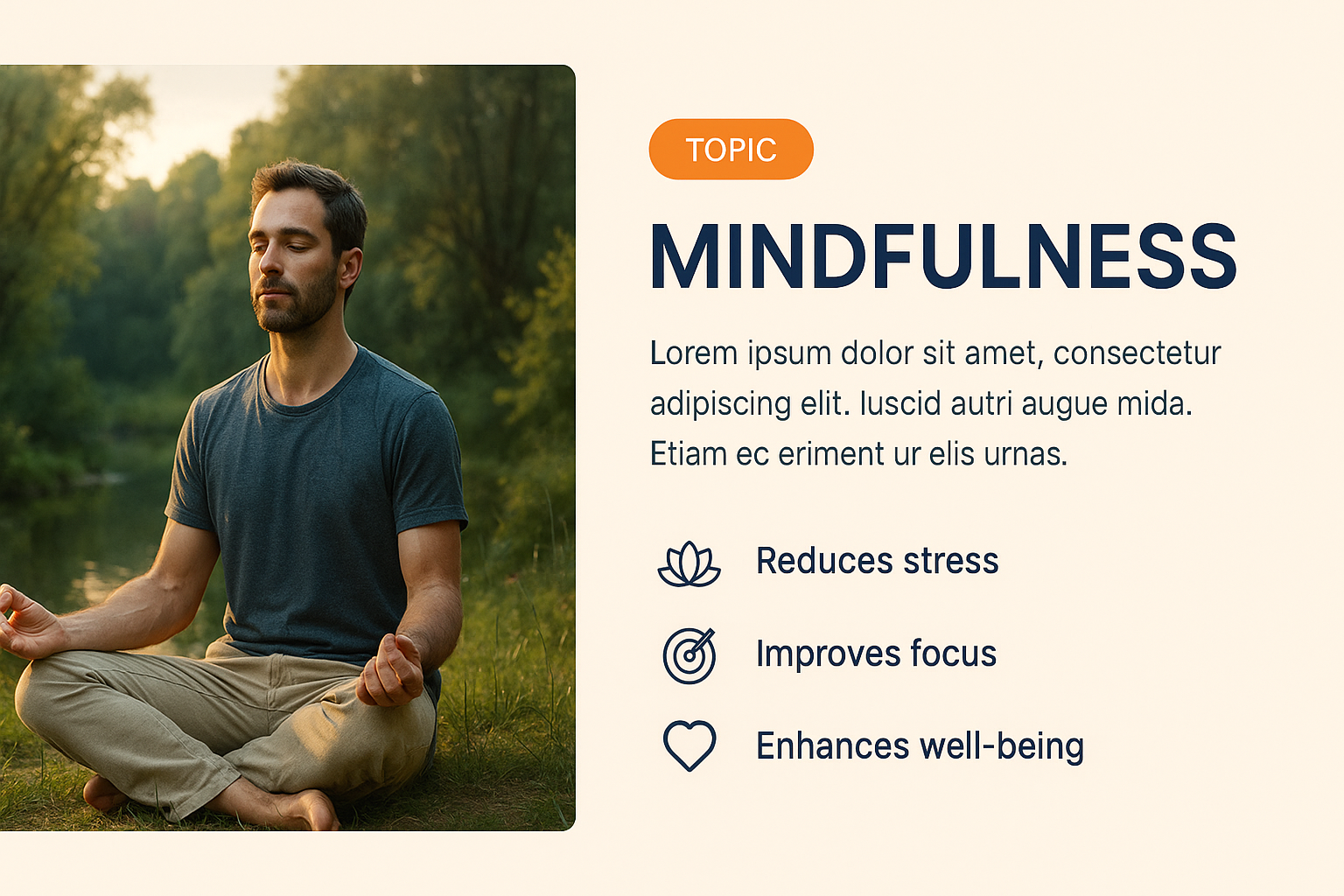A serene mindfulness imagery featuring a person meditating in nature, designed for wellness and mental health content. The layout includes informative elements and soothing colors.