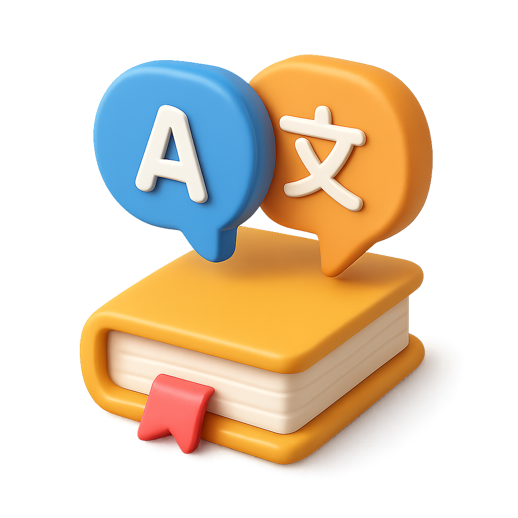 A colorful 3D icon featuring a book with a speech bubble in blue and orange, symbolizing bilingualism. The design has a transparent background and a volumetric, isometric feel.