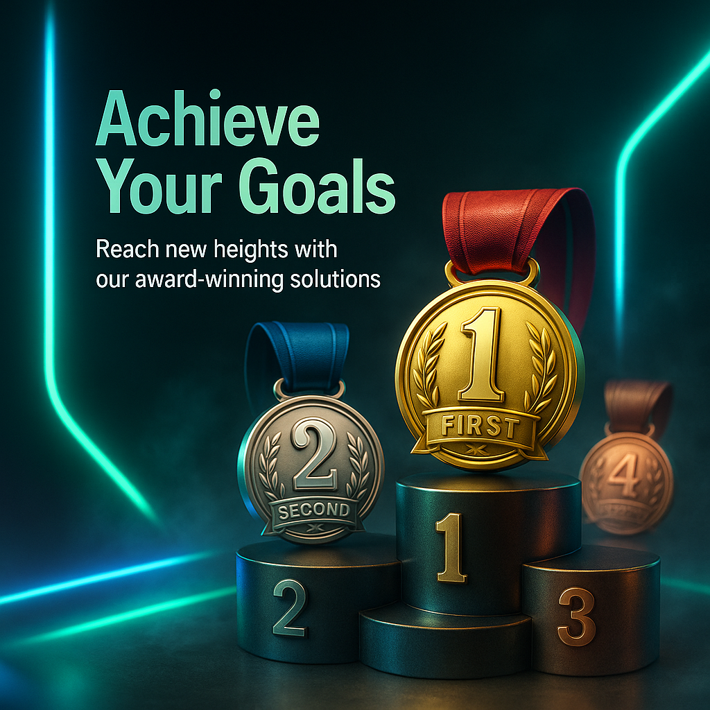 A visually striking design featuring gold, silver, and bronze medals on a podium, infused with neon accents and a dynamic background. Ideal for promoting achievements.