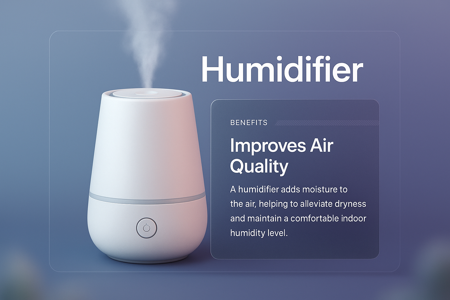 /Collection: /by davooda/Type: PNG/A modern humidifier showcased with a gradient background and integrated text blocks, enhancing its visual appeal. The design emphasizes air quality improvement and stylish aesthetics.