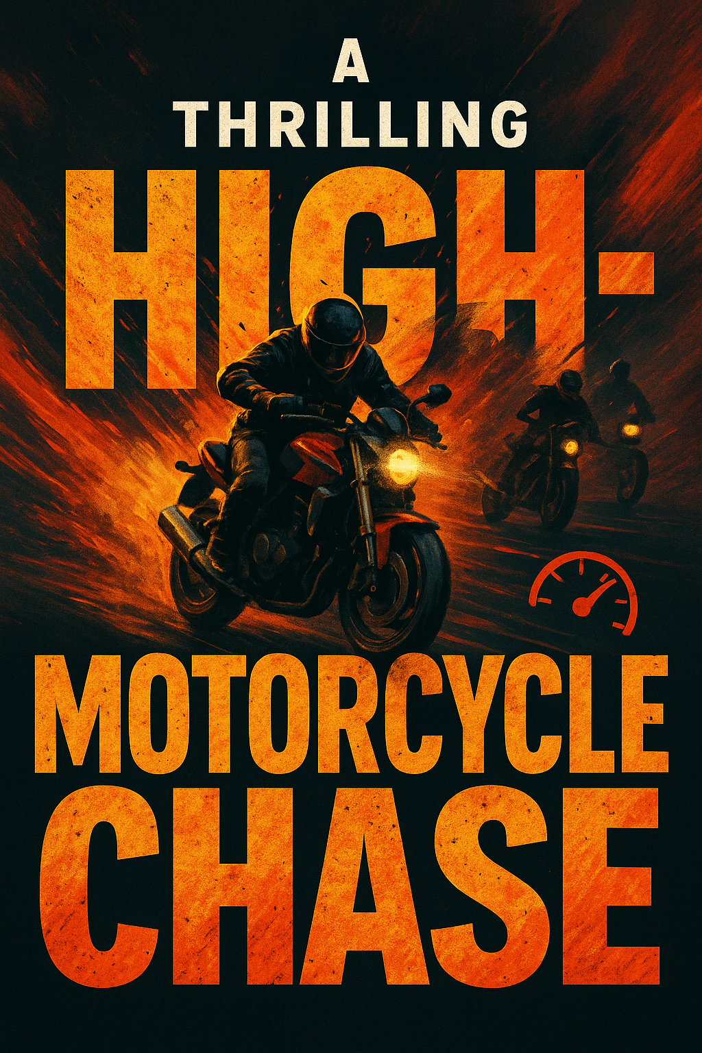 Dynamic Motorcycle Chase Illustration with Bold Typography